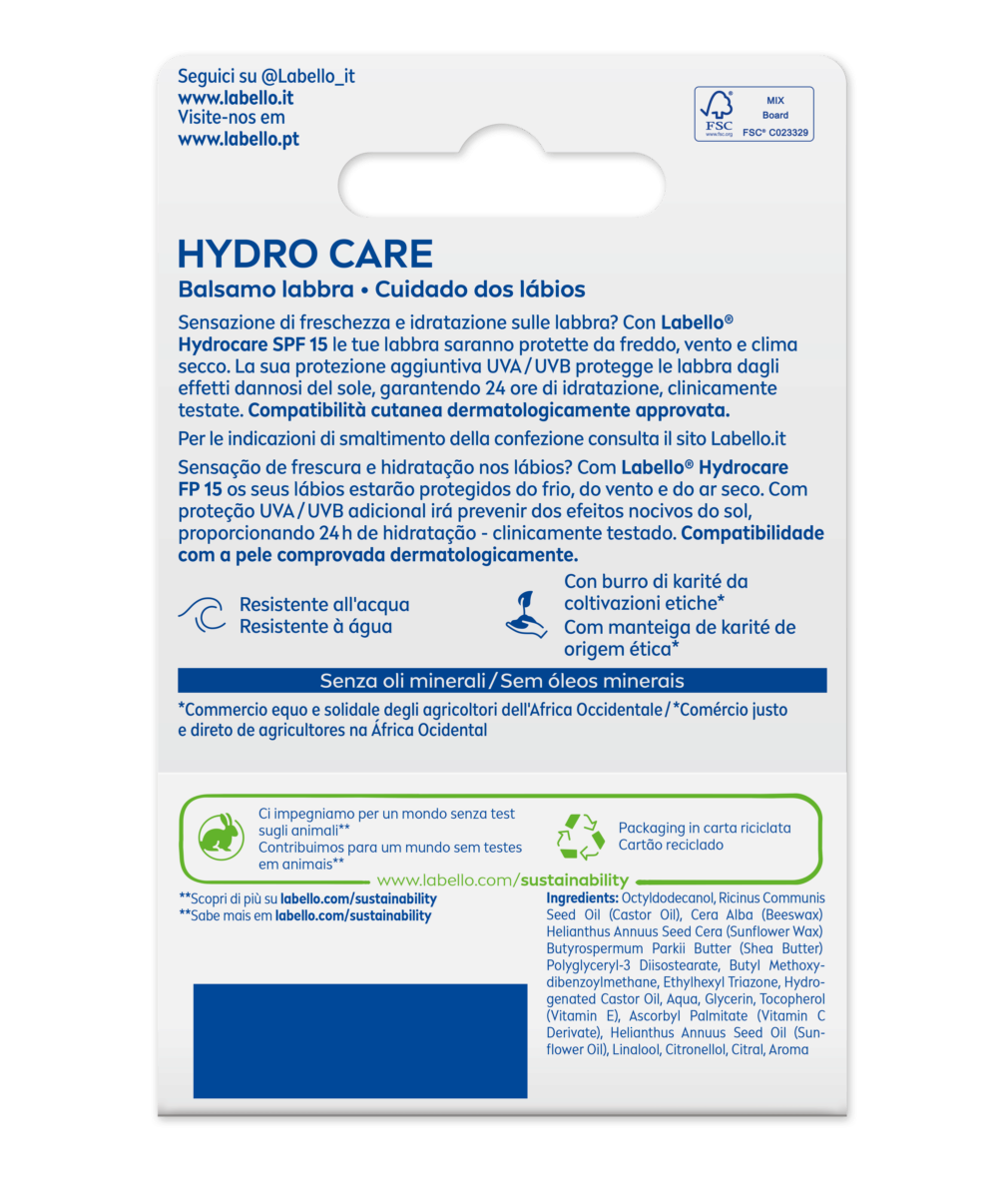 O Bálsamo Labial Labello Hydro Care é clinicamente testado, formulado com ingredientes de origem natural e não contém óleos minerais. A compatibilidade cutânea deste bálsamo foi dermatologicamente comprovada. Não testado em animais.